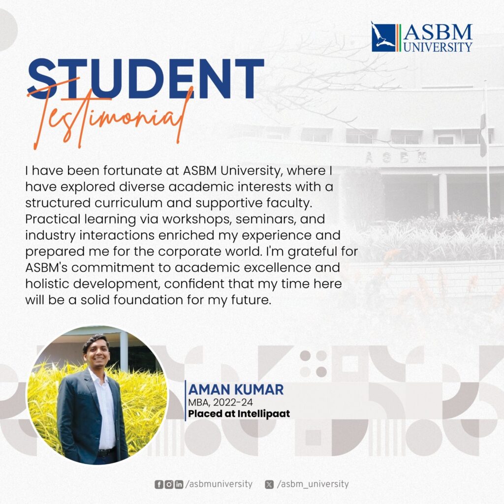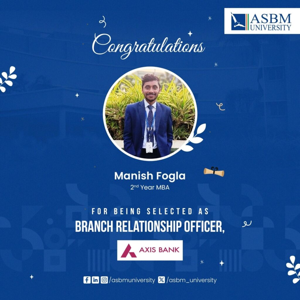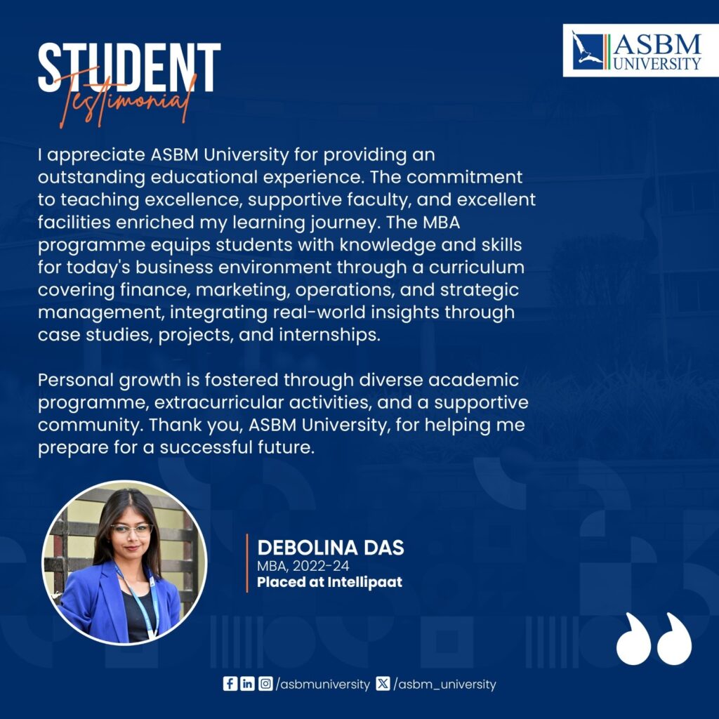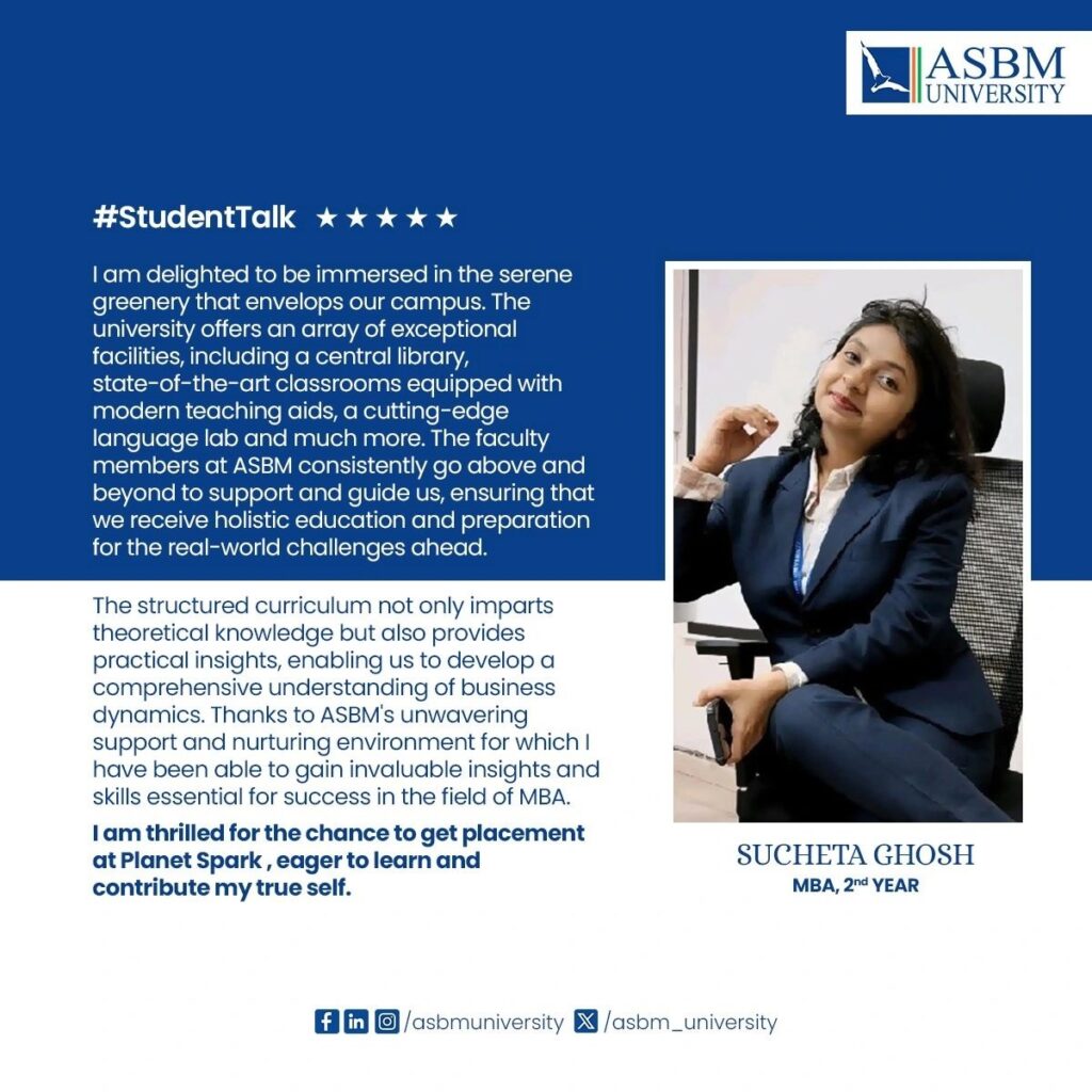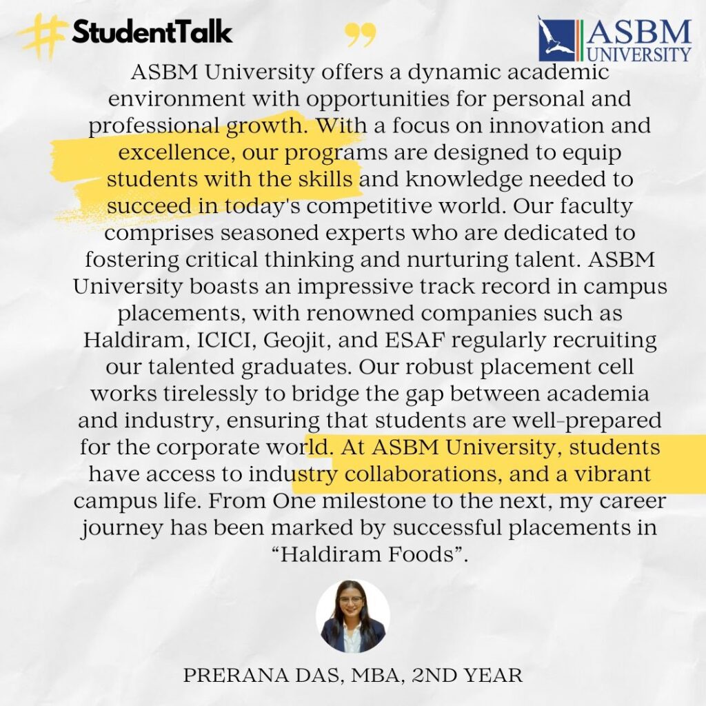 ASBM University has established its credibility through quality education backed by academic rigor with industry focused curricula and practical hands-on training on soft skills, and professional etiquette through the Finishing School Modules. The Power Packed Personality & Employability Grooming Module (3PEGM), supported by learning through language lab and psychometric lab makes the students industry-ready – thus, enhancing the employability of the students. The University takes all initiatives for competency development of the students to exert high performance. From the first graduating batch of 2008, the students have consistent record of excellent placement year after year in blue-chip companies. Large number of alumni now occupy very prominent positions across the globe in leading organisations. Every year, more than fifty companies participate in the campus placement drive and many students receive multiple job offers. The strong industry linkage of the University ensures many prominent companies to recruit continuously batch by batch. In fact, the excellent placement legacy of MBA students has now been extended by the companies to other programmes, both in UG and PG, of different schools of the University. The University has also the track record of hundred percent summer placements.