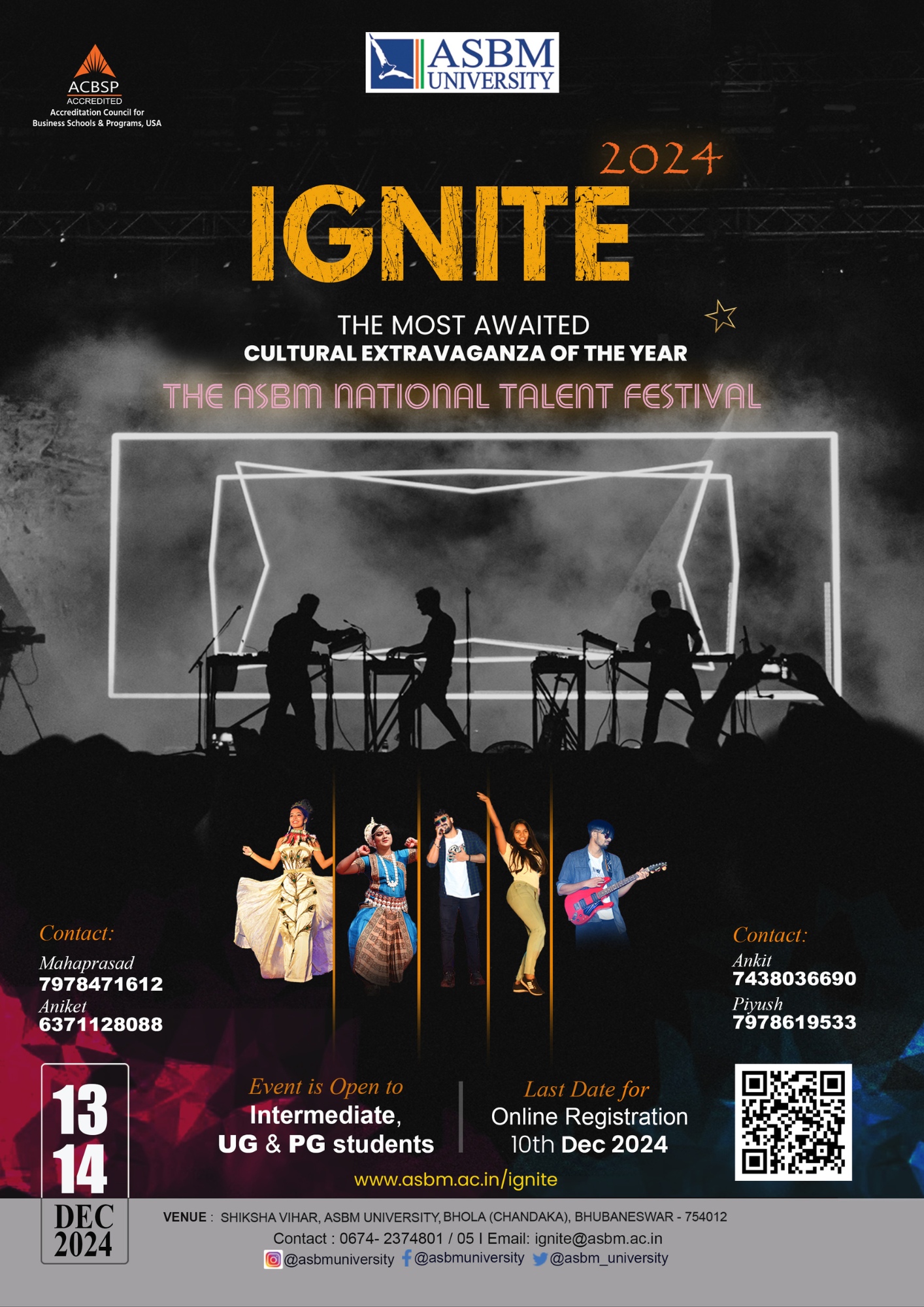 ASBM University is excited to present IGNITE’24 – The ASBM Talent Fest, scheduled for December 13th and 14th, 2024, on our dynamic campus. This annual event highlights young talent in management and culture, promoting professionalism, creativity, and friendship.