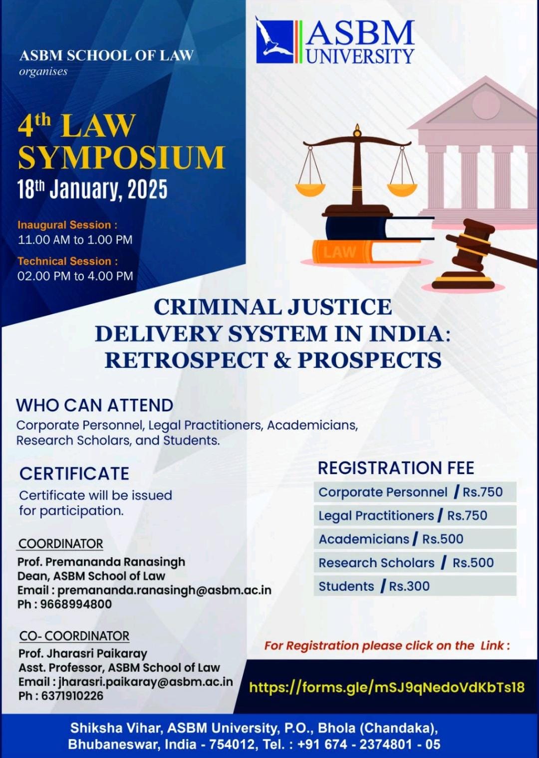 The ASBM School of Law at ASBM University proudly announces the 4th Law Symposium, a distinguished academic and professional gathering aimed at dissecting the intricacies of the criminal justice delivery system in India. The symposium, themed Criminal Justice Delivery System in India: Retrospect & Prospects, will convene on 18th January 2025 at the university’s Shiksha Vihar campus in Bhubaneswar.